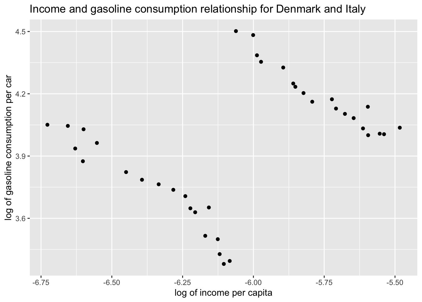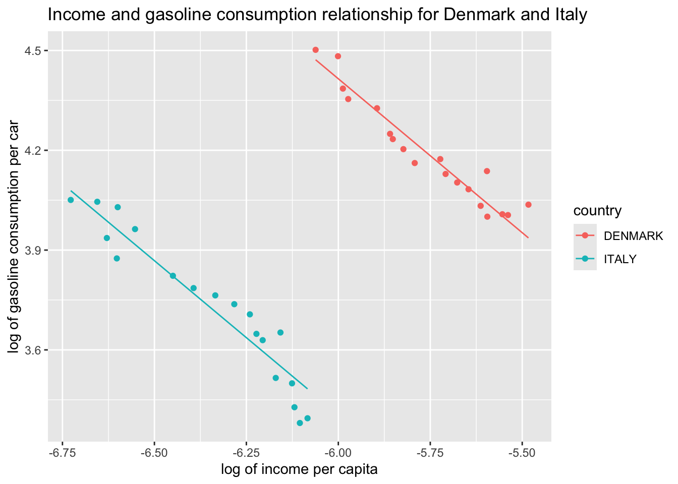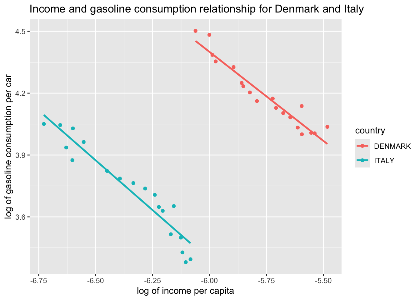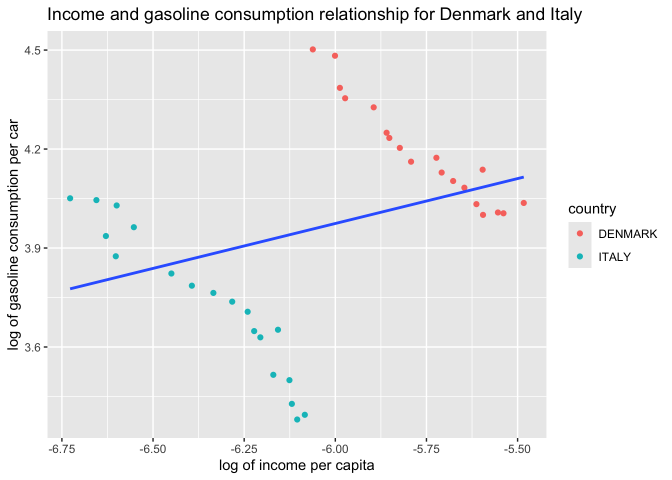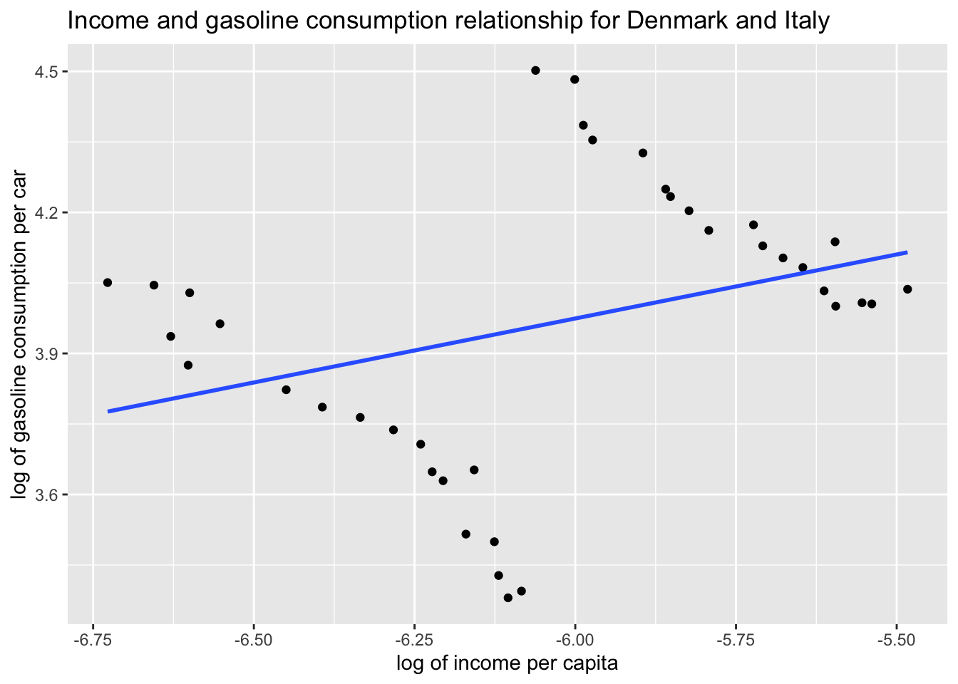 The above plot fit an OLS regression line to the data points in our scatter plot. But it seems like something is wrong. Separate scatter plots for Denmark and Italy revealed a negative relationship between log income per capita and log gasoline consumption per car whereas the above regression line suggests a positive relationship. Which one is correct?
