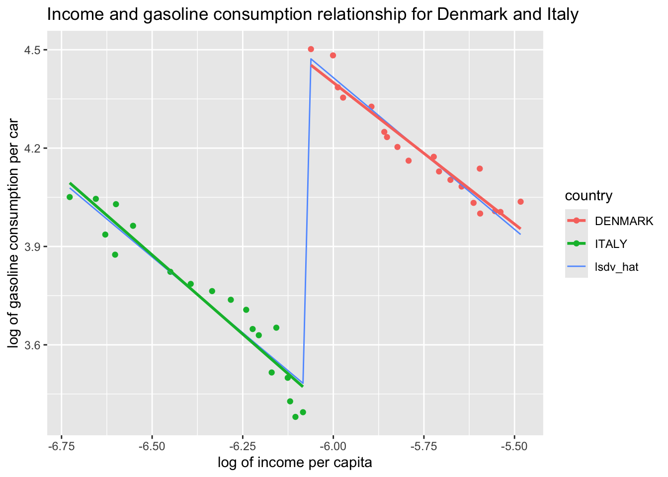 The LSDV approach assumes a command slope for Italy and Denmark, but captures the constant distance between them through a country dummy. Note that the slope coefficient will give us the average effect for all countries in sample and will be different than the coefficients we would obtain if we were to estimate separate regressions for each country.