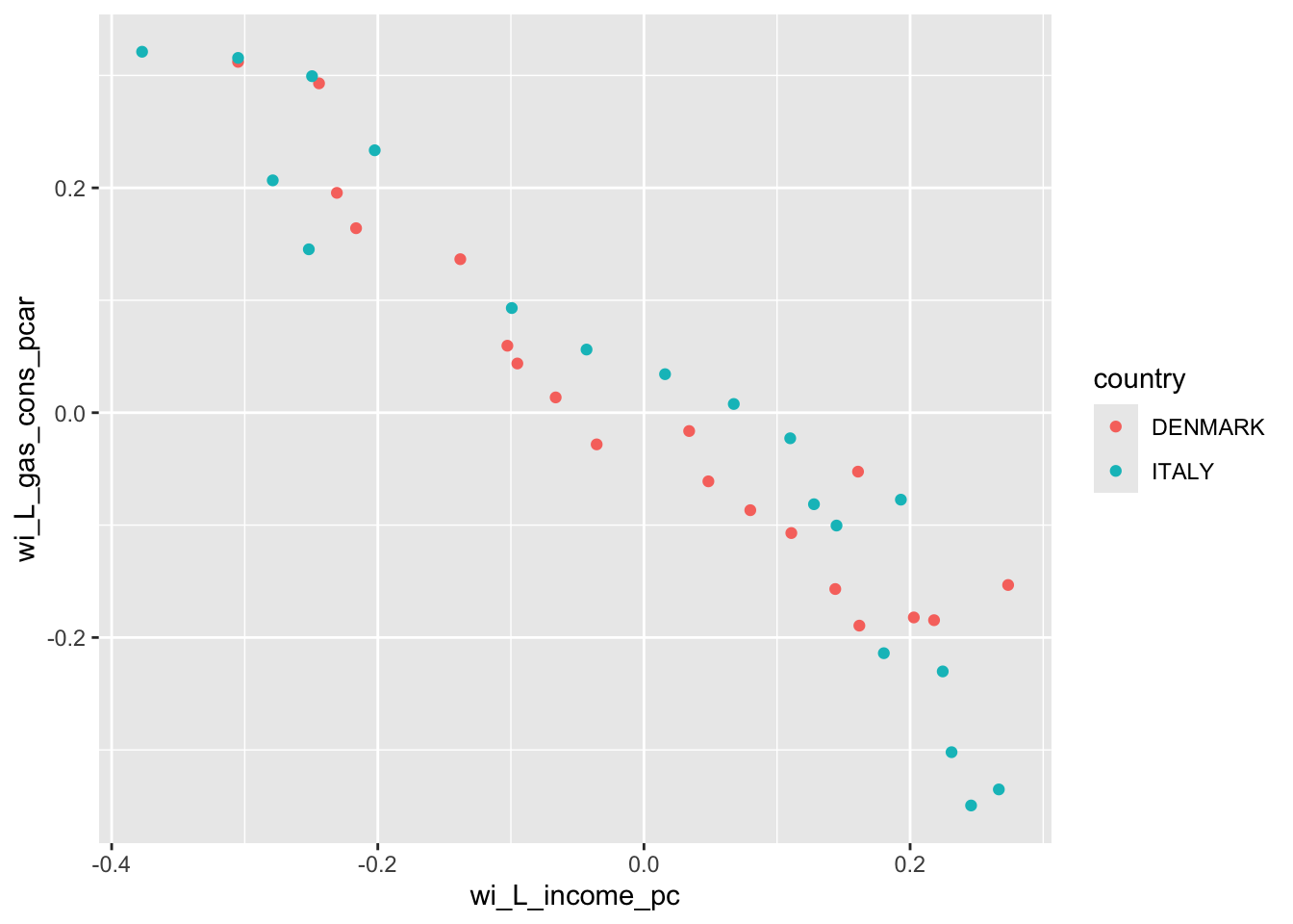 We see that in Denmark, on average, gasoline consumption per car is around 174% higher than in Italy, holding income per capita levels constant. Can you figure out how did we get that number?