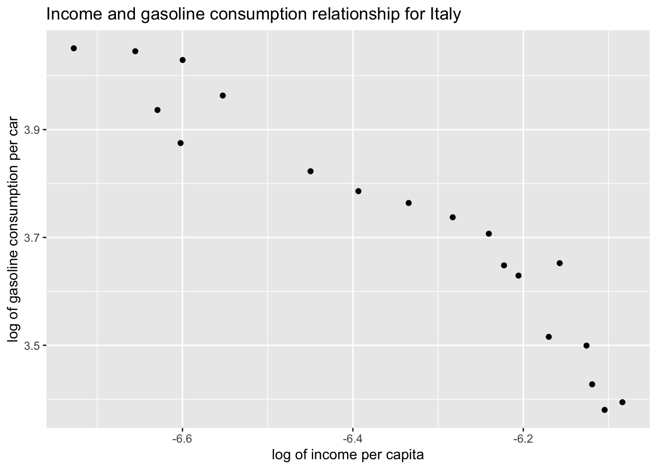 ggplot(df_Italy, aes(x = L_income_pc, y = L_gas_cons_pcar)) +geom_point() +labs(x ="log of income per capita", y ="log of gasoline consumption per car", title ="Income and gasoline consumption relationship for Italy" )