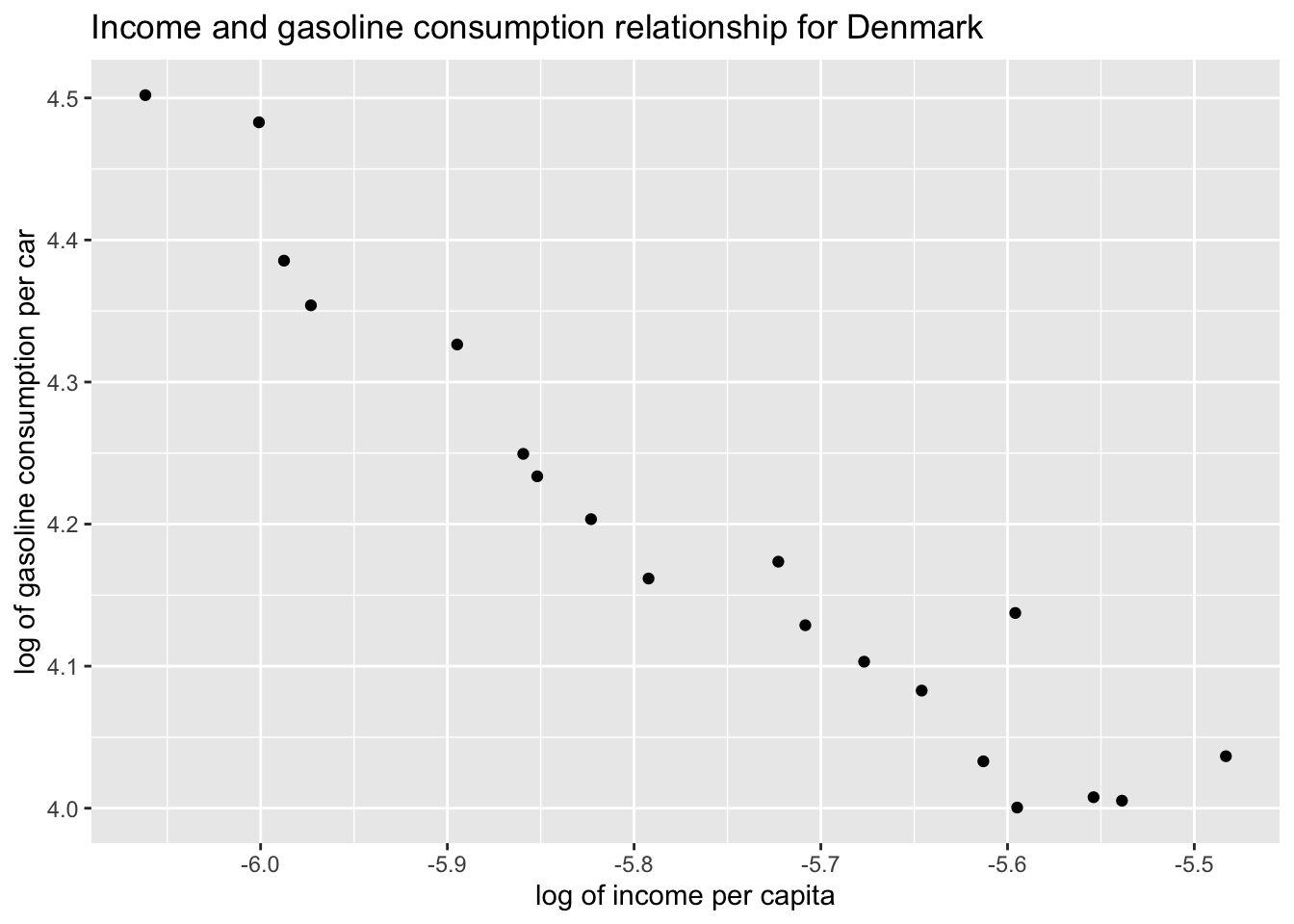 ggplot(df_Denmark, aes(x = L_income_pc, y = L_gas_cons_pcar)) +geom_point() +labs(x ="log of income per capita", y ="log of gasoline consumption per car", title ="Income and gasoline consumption relationship for Denmark" )