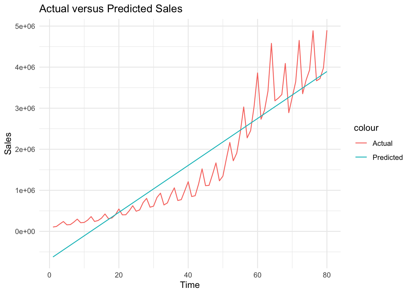 # Plot actual versus predicted Salesggplot(df, aes(x = Time)) +geom_line(aes(y = Sales, color ="Actual")) +geom_line(aes(y= sales_hat_m1, color ="Predicted")) +theme_minimal() +labs(title ="Actual versus Predicted Sales", x ="Time", y ="Sales")