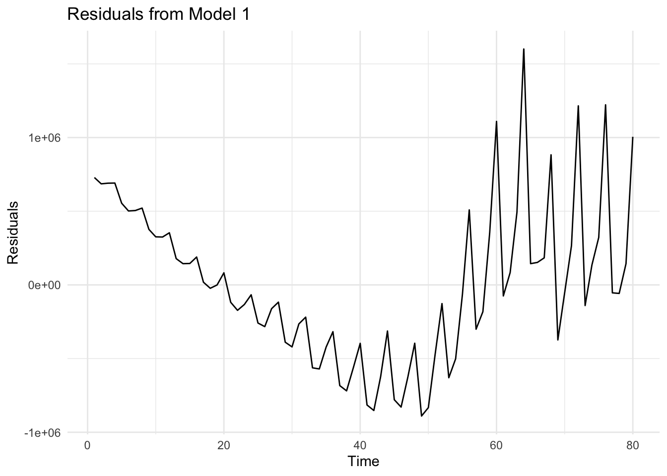 # Save residuals from model_1df$residuals_m1 <-residuals(model_1)# Residual plotggplot(df, aes(x = Time, y = residuals_m1)) +geom_line() +theme_minimal() +labs(title ="Residuals from Model 1", x ="Time", y ="Residuals")