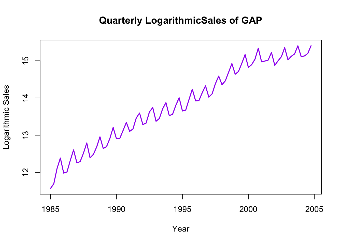 # Plot of logarithmic sales (first approach - convert to time series)ln_sales_ts <-ts(df$ln_sales, start =c(1985, 1), frequency =4) # covenrt the ln_sales into time seriesplot(ln_sales_ts, col ="purple", lwd =2, xlab ="Year", ylab ="Logarithmic Sales", main ="Quarterly LogarithmicSales of GAP")