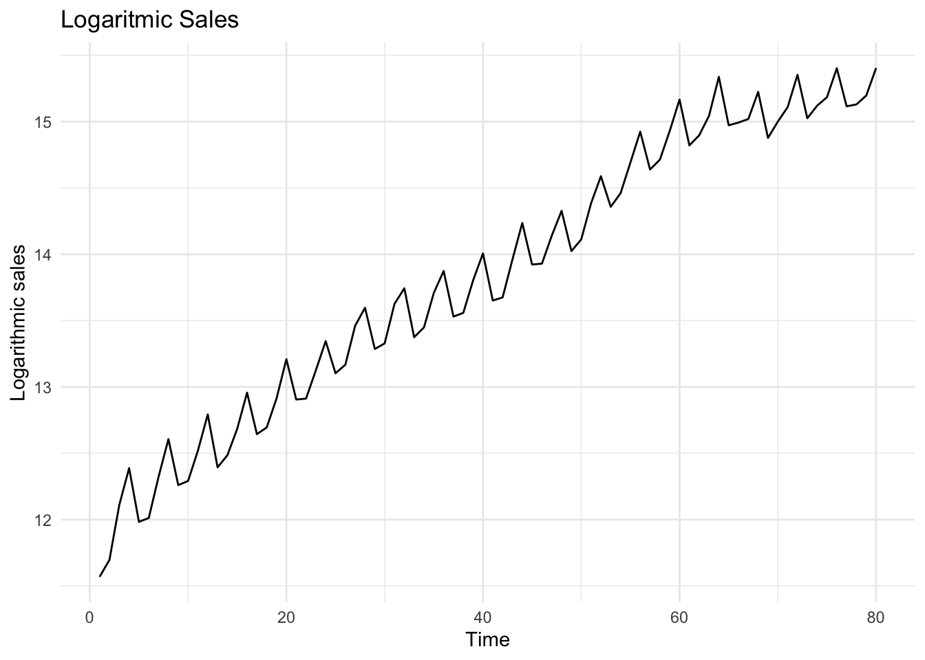 # Plot of logarithmic sales (second approach - use ggplot)ggplot(df, aes(x = Time, y = ln_sales)) +geom_line() +theme_minimal() +labs(title ="Logaritmic Sales", x ="Time", y ="Logarithmic sales")