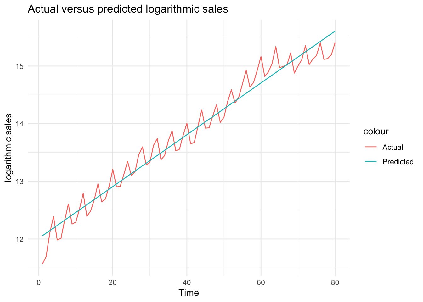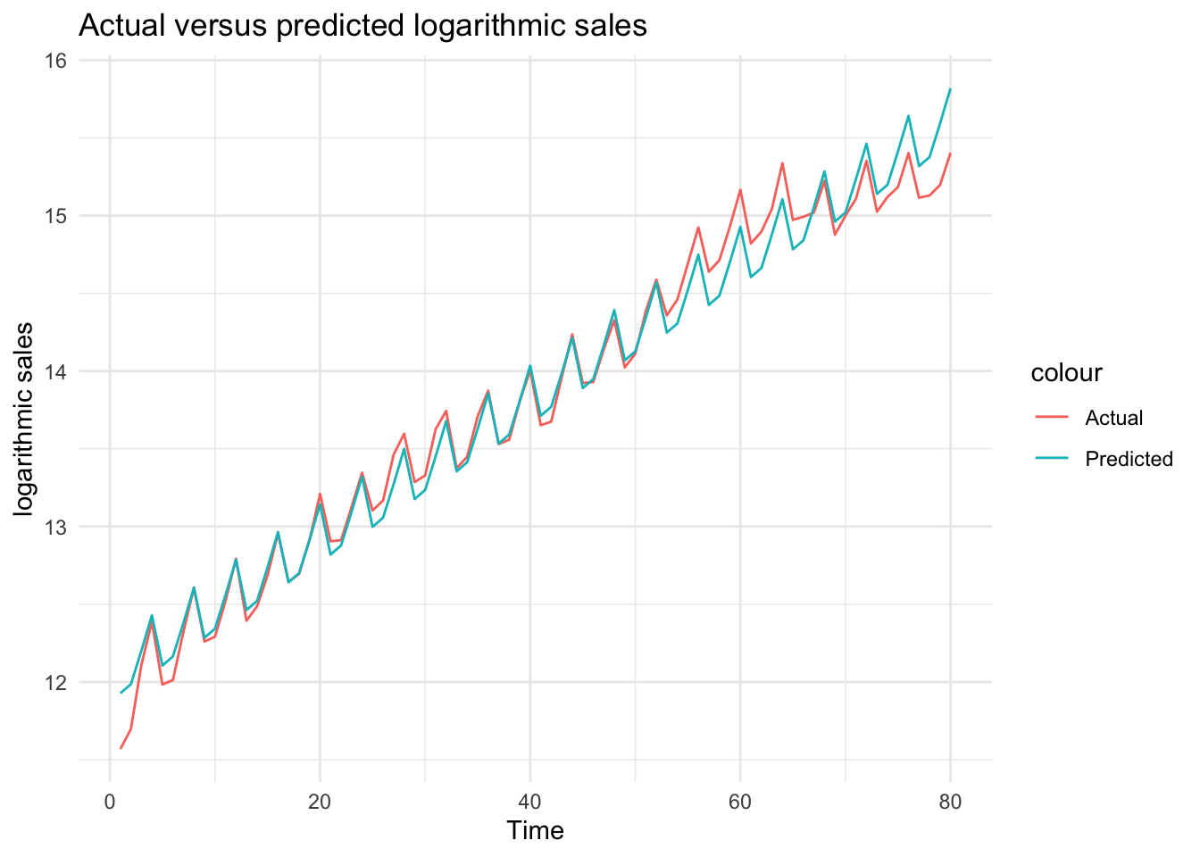 # Obtain predictions from model_3df$ln_sales_hat_m3 <-predict(model_3)# Plot actual versus predicted log salesggplot(df, aes(x = Time)) +geom_line(aes(y = ln_sales, color ="Actual")) +geom_line(aes(y = ln_sales_hat_m3, color ="Predicted")) +theme_minimal() +labs(title ="Actual versus predicted logarithmic sales", x ="Time", y ="logarithmic sales")