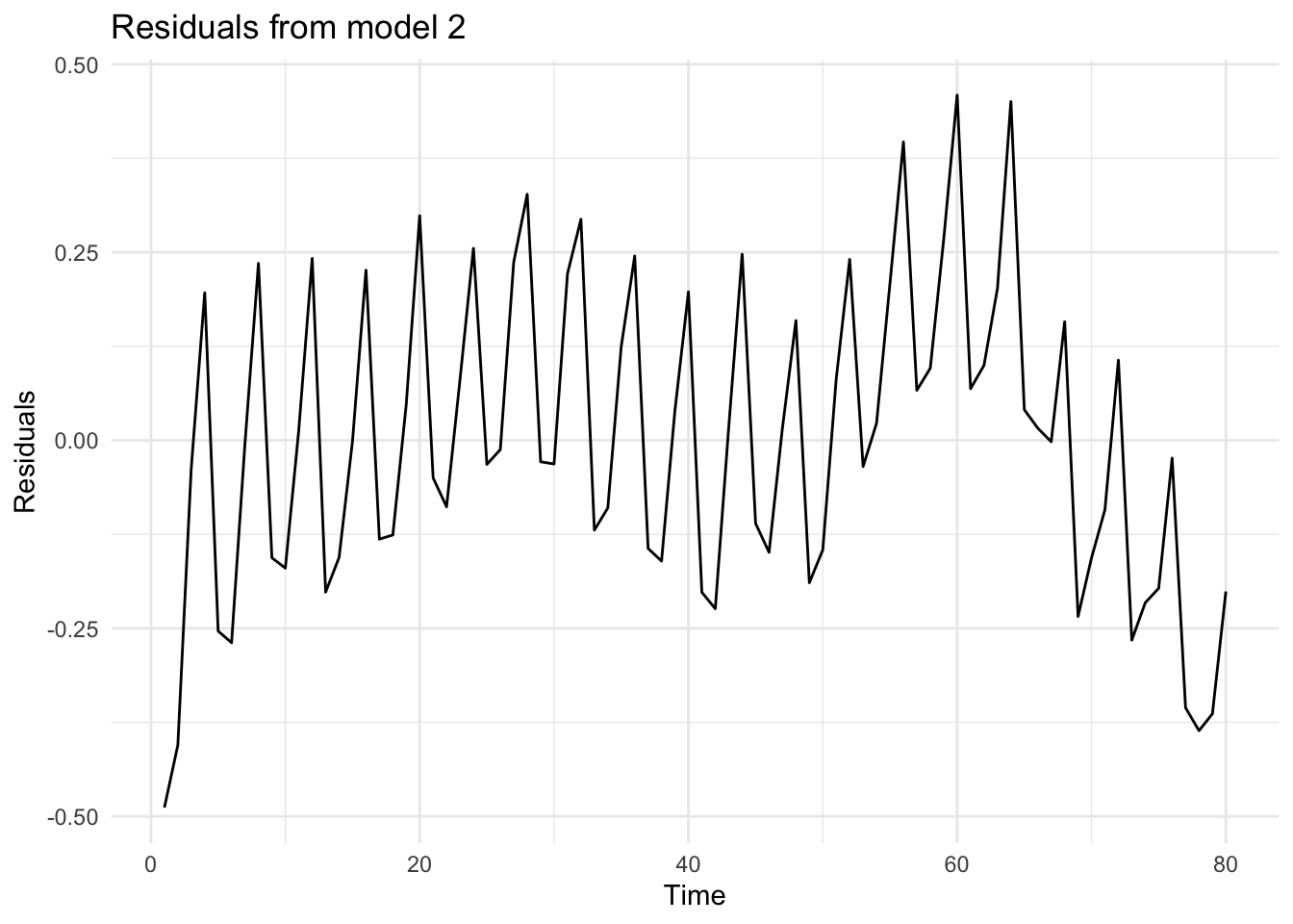 # Residuals from model_2df$residuals_m2 <-residuals(model_2)# Plot residuals from model_2ggplot(df, aes(x = Time, y= residuals_m2))+geom_line() +theme_minimal() +labs(title ="Residuals from model 2", x ="Time", y ="Residuals")