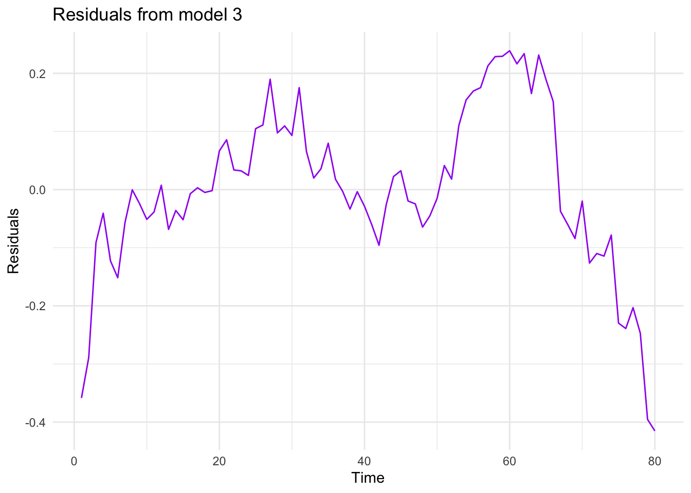 # Residuals from model_2df$residuals_m3 <-residuals(model_3)# Plot residuals from model_2ggplot(df, aes(x = Time, y= residuals_m3))+geom_line(color ="purple") +theme_minimal() +labs(title ="Residuals from model 3", x ="Time", y ="Residuals")