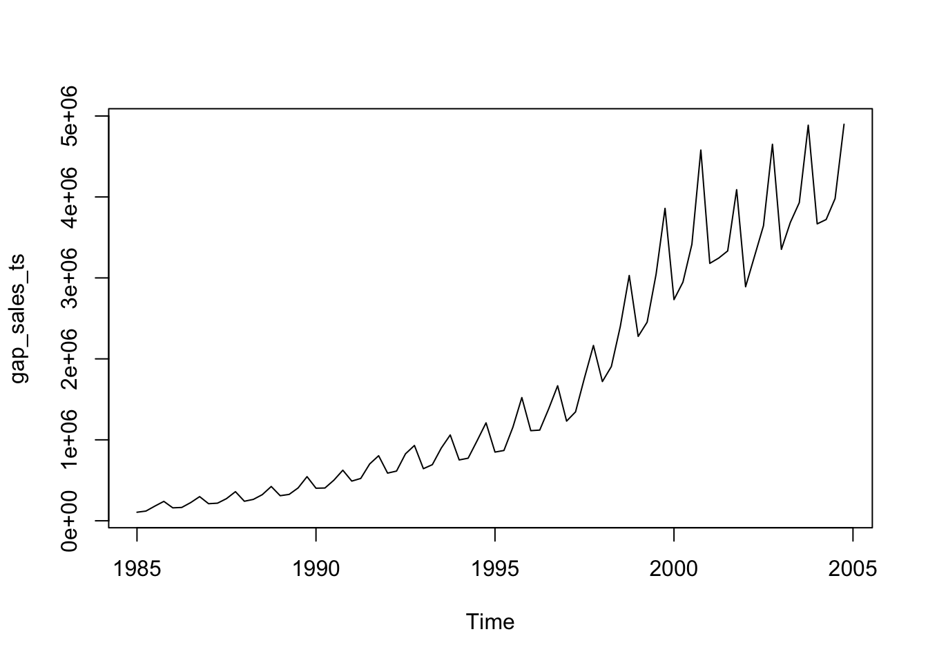 Sales is the variable we are interested in our data. So, let us start by introducing a time dimension to that series. In the code below, we create a single numeric vector, gap_sales_ts by defining the start date and the frequency of the Sales variable. Our variable starts from the first quarter of 1985 with a frequency of 4 (it is a quarterly data, repeating every 3 months).