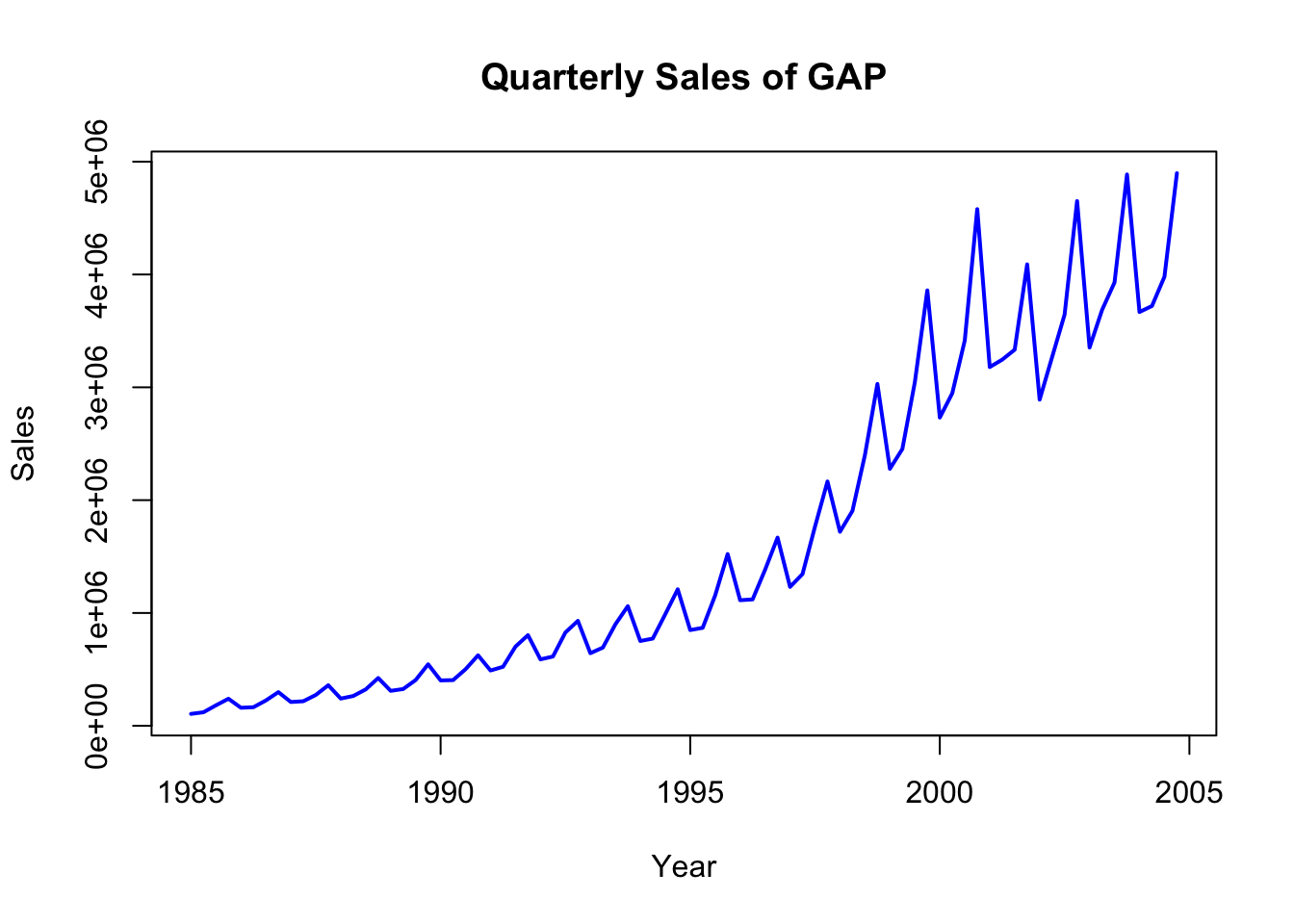 plot(gap_sales_ts, col ="blue", lwd =2, xlab ="Year", ylab ="Sales", main ="Quarterly Sales of GAP")