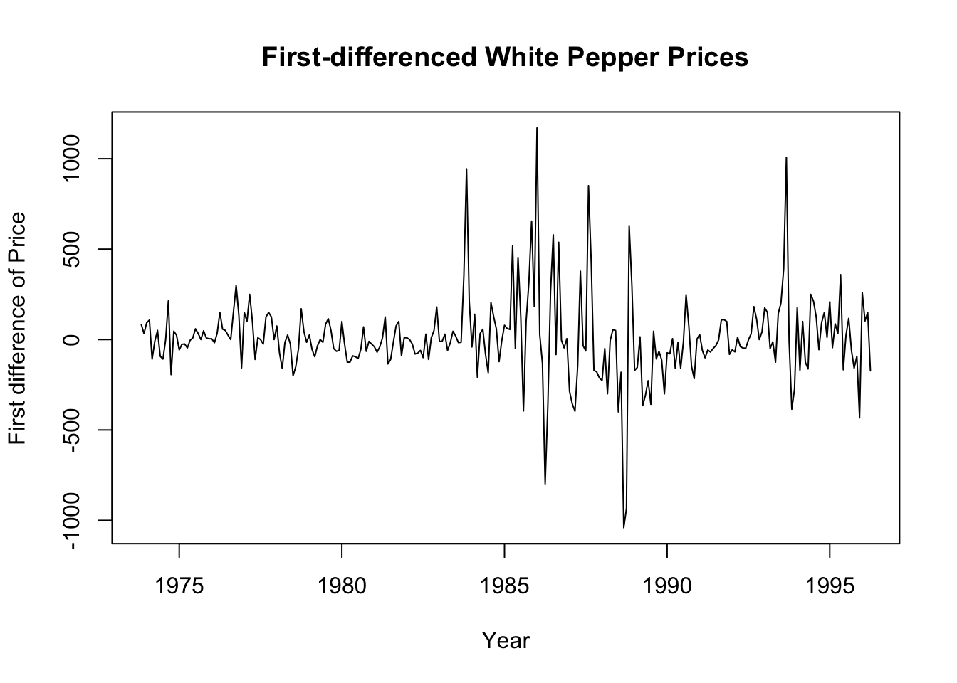 # Plot the first differenced white pepper priceplot(diff(PepperPrice[, "white_pepper"]), xlab ="Year", ylab ="First difference of Price", main ="First-differenced White Pepper Prices")