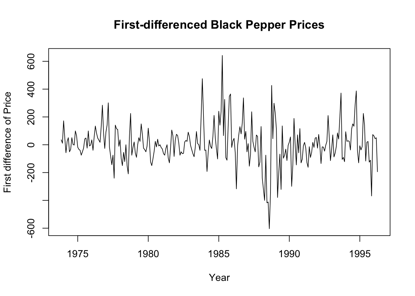 # Plot the first differenced black pepper priceplot(diff(PepperPrice[, "black_pepper"]), xlab ="Year", ylab ="First difference of Price", main ="First-differenced Black Pepper Prices")