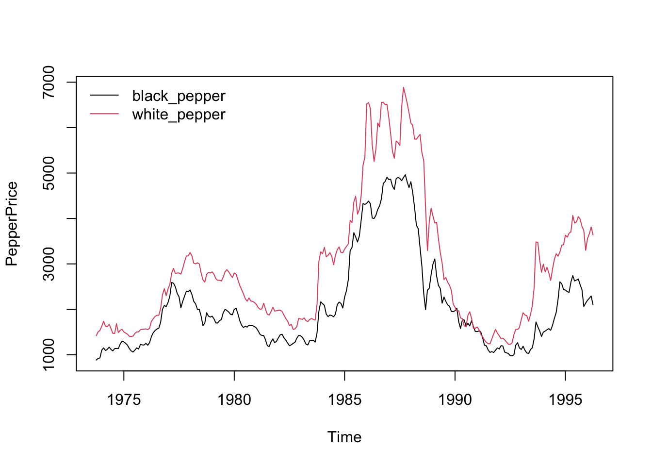 plot(PepperPrice, plot.type ="single", col =1:2)legend("topleft", c("black_pepper", "white_pepper"), bty ="n", col =1:2, lty =rep(1,2))